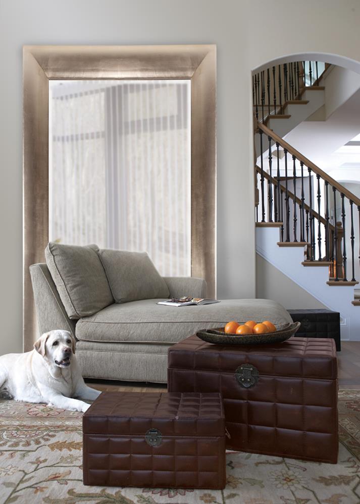 All be it a simple frame, the Barron Mirror is anything but quaint. It will command any room with its large rectangular frame. It is finished in a warm silver leaf. The mirror is beveled adding to its style and beauty. It is a perfect focal point for an entryway, bathroom, bedroom or any room in your home. D-rings are affixed to the back of the mirror so it is ready to hang right out of the box! The Barron Mirror can be hung in a horizontal or vertical orientation. It also comes with special security hardware to secure the piece when using as a floor mirror. Make any room appear instantly brighter and larger simply by adding this mirror to the mix.