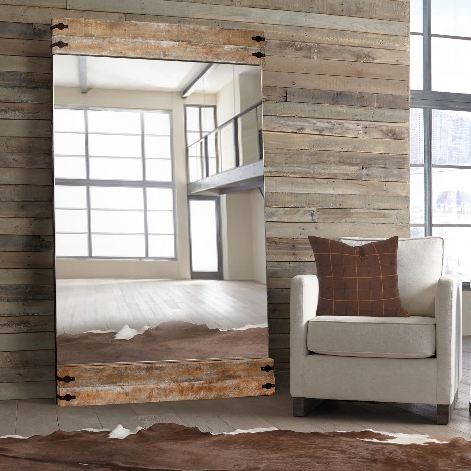This oversized floor mirror makes a stately appearance with a large rectangular glass with a reclaimed oak wood planks at the top and bottom with wrought iron bolt accents. The mirror comes with D-rings affixed to the back of the frame so you can hang it right on your wall straight out of the box. However, if you prefer it as a floor mirror, it also comes with security hardware to safely lean against your wall. Make any room brighter or appear larger simply by adding the Garrett Mirror to the mix.