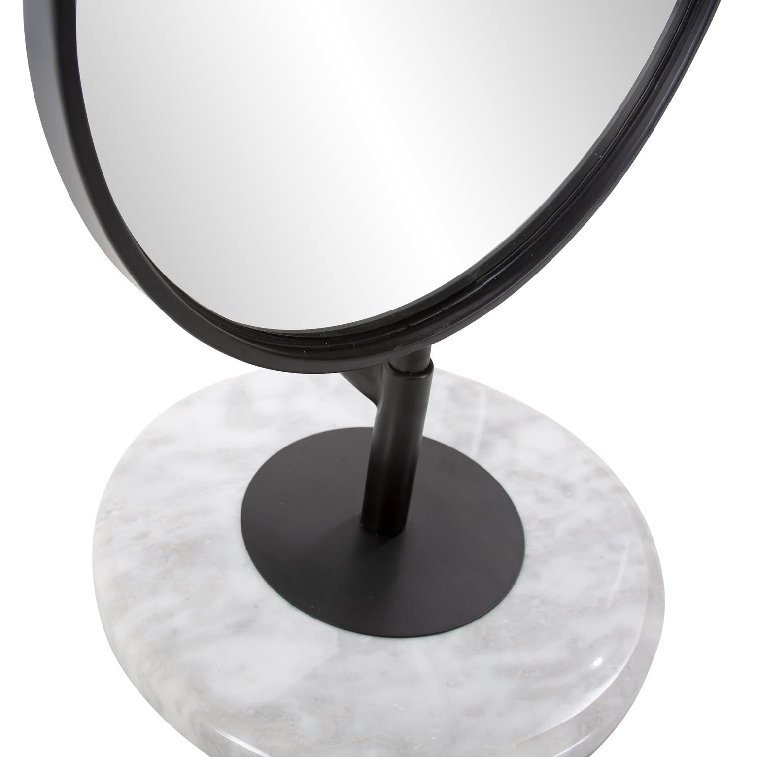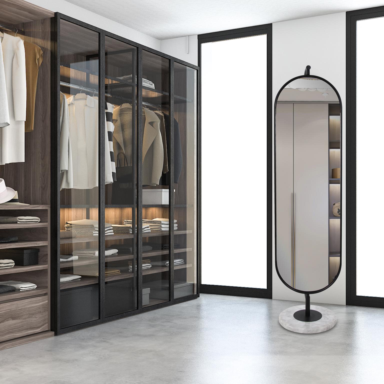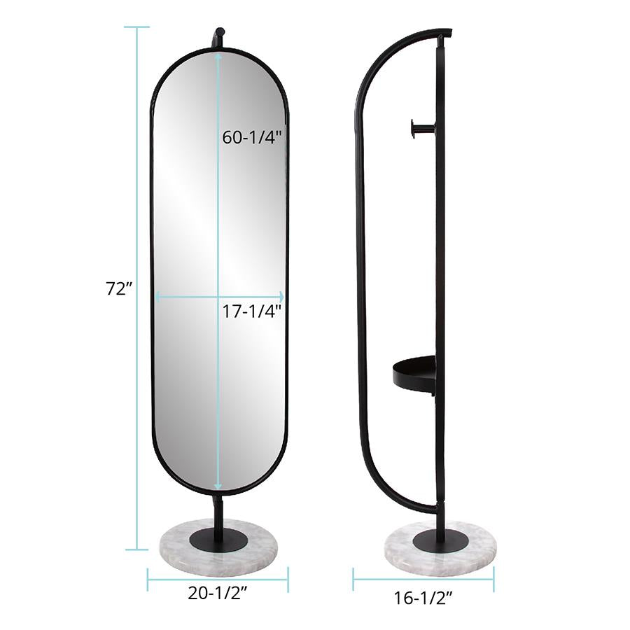 The combination of style and function has never been so well defined, as in the Sardiff spinning dressing mirror. From the white marble base to the sleek curved matte black metal frame, this mirror definitely creates a designer presence in any bedroom or dressing room. Once the mirror is spun around it's great functionality becomes very evident with a top row of modern metal hangers and deep half round metal pocket shelf. The Sardiff mirror truly makes a small space more usable as well as visually striking.