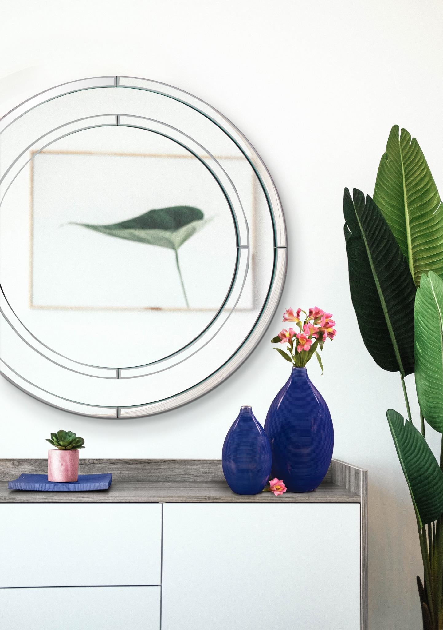 The Del Noble features beautifully rounded mirror with layered mirror on mirror pieces. Each layered piece features beveled edges that adds depth and an artful play of reflections. Beautifully suited for a contemporary setting or a luxurious traditional home, this mirror will be the perfect solution to that hard to fill space.